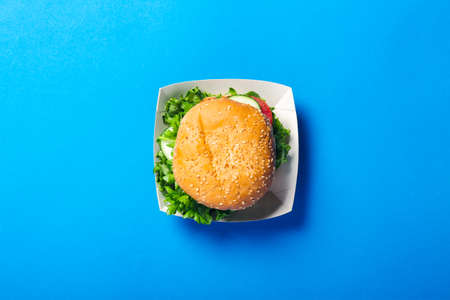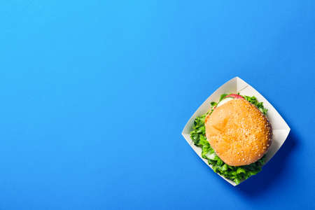 Fresh burger on a bright blue background. Flat lay, top view.