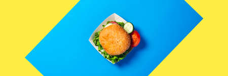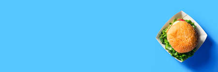 Fresh burger on a bright blue background. Flat lay, top view. Banner