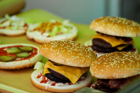 Close-up of a standard burger. Adult fast food in a restaurant or cafe. Macro photo of burger ingredients with meat, cheese and herbs. Eco burgers for the whole family