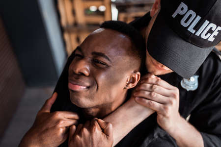selective focus of detained african american man lying on ground near policeman with truncheon, racism concept