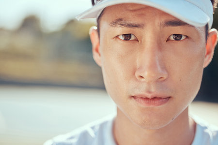 Sports, tennis and portrait of a sweating man with vision, goal and mission for game, competition or outdoor practice with sunshine. Young asian professional player with a serious or determined face