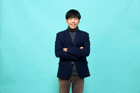 young Southeast Asian man with happy and self-confident positive expression with crossed arms in light blue studio isolated background