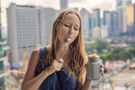 Young woman eating chia pudding on her balcony overlooking the big city.