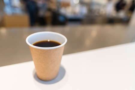 White color hot coffee paper cup on blurred coffee shop background. with copy space to put logos and text.
