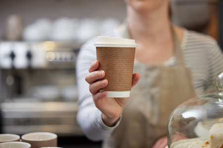 Close Up Of Female Worker in Cafe Serving Coffee In Sustainable Recyclable Cup