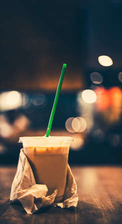 Iced coffee in coffee shop with bokeh light background