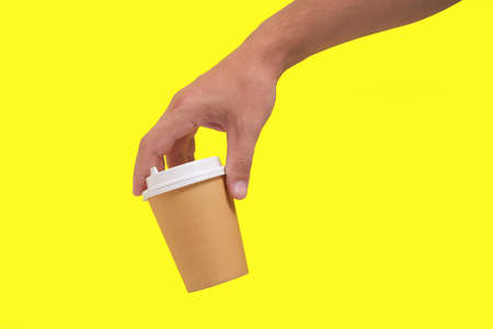 Disposable coffee cup in hand yellow background. Coffee to take away