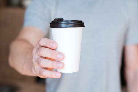 Good morning. Wake up. Energy and vitality drink. Man offering paper coffee cup. Cropped shot.