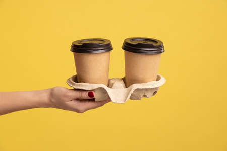 Hands holding two cups brown paper with black lid. Two coffee special offer or promo. Hands holding two cups on yellow screen background. Tea or Coffee to go. Brown paper cup with black lid.