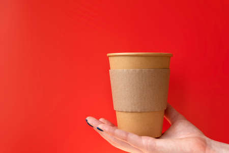 Kraft paper coffee cup in hand on the red background. Female hand with manicure holding a cup of tea or coffee. Hot drinks presentation concept with copy space or place for your text. Photo mockup