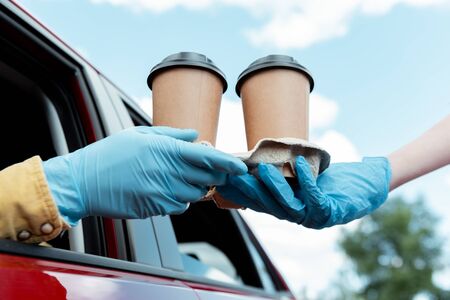 cropped view of man in protective gloves buying takeaway coffee from car during coronavirus pandemic