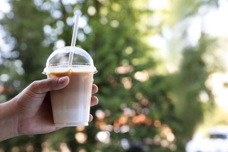 Man holding plastic takeaway cup of delicious iced coffee outdoors, closeup. Space for text