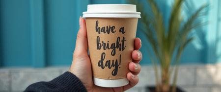 A hand holding a takeaway coffee cup with the message have a bright day! printed on it, promoting positivity and good vibes.