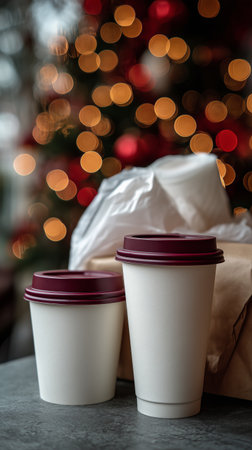 Two paper coffee cups sit on a table, with a cozy setup featuring wrapped gifts and a decorated tree in the background, creating a warm holiday atmosphere.