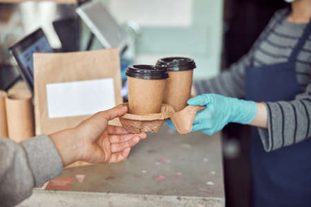 Customer in face mask stand outdoors and take package with coffee from cashier in mask at cafe. Take away food. Close up of hands. Quarantine