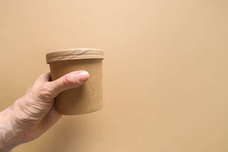 Disposable cardboard soup cup in woman's hand on brown paper background with copy space. Ecological individual package.