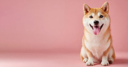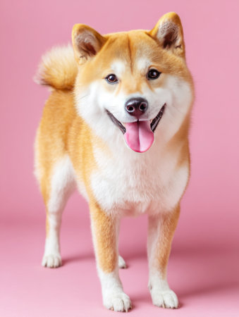 Studio shot of shiba inu dog sitting on pink background, with tongue out, panting and looking forward