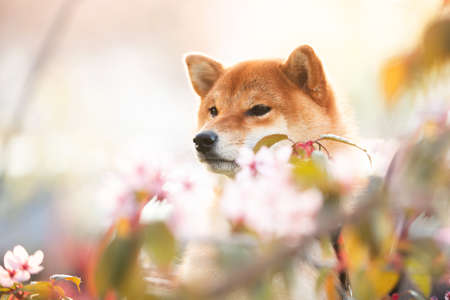 Close-up portrait of gorgeous red shiba inu dog on cherry blossom's background. Profile of Beautiful Japanese shiba inu female dog and blooming sakura. Hanami