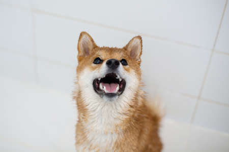 Close-up portrait of wet, funny and cute shiba inu dog in bathtub. Red shiba inu dog