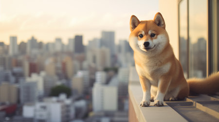 Alert shiba inu standing on a quiet urban sidewalk during the evening with soft natural light and blurred city background.