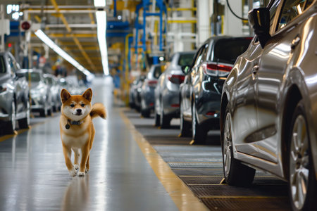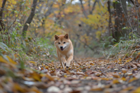 Shiba Inu dog displays a happy expression while enjoying a playful outdoor walk, surrounded by nature, highlighting its vibrant fur and healthy appearance