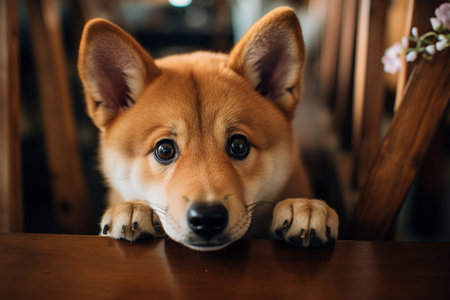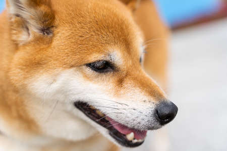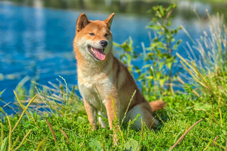 young puppy of japanese dog breed enjoys outdoor recreation in rays of the sun, portrait shiba inu close-up smiles red dog, friendship concept, pet with sad eyes, shibainu pet