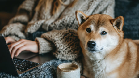 A serene indoor scene featuring a Shiba Inu dog sitting beside a person working on a laptop while enjoying a warm cup of coffee. The cozy atmosphere highlights relaxation and companionship in a modern home setting.