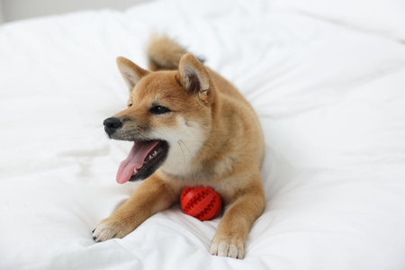 Shiba Inu dog with colorful balls. dog in a field of colorful flowers