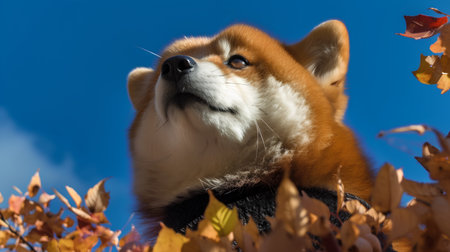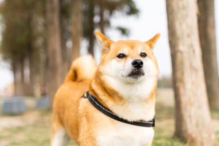 A Fox-like dog is a Shiba Inu. Charming dog with plush fur and wayward character on a walk in the autumn Park.
