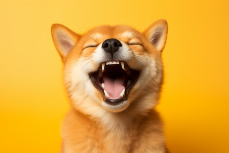 Happy shiba inu dog smiling with closed eyes on a vibrant yellow background. Ai generated image