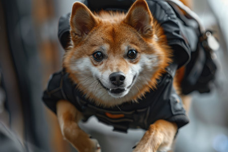 Funny photo of the Shiba Inu dog in a pilot suit at the airport
