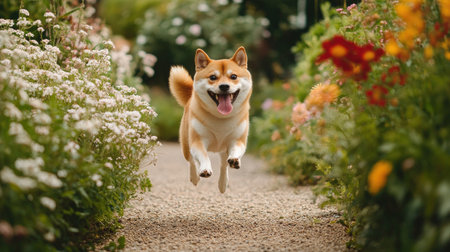 A Shiba Inu running on a gravel path in a park, with its curly tail high and tongue out, framed by a beautiful display of blooming flowers