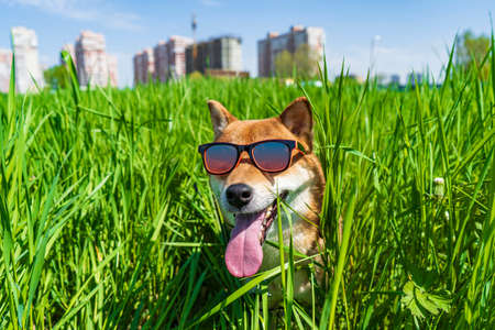 Happy dog wearing sunglasses. Red-haired Japanese dog smile portrait.