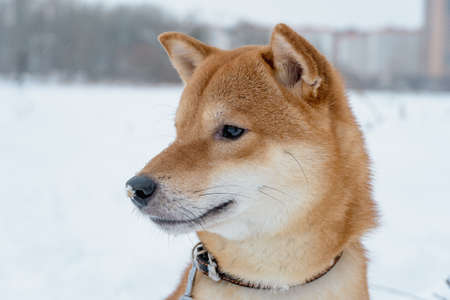 The Shiba Inu Japanese dog plays in the snow in winter.