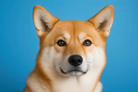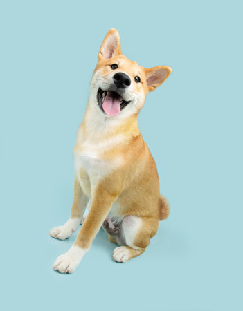 Portrait shiba inu puppy dog sitting with happy expression face. Isolated on blue pastel background