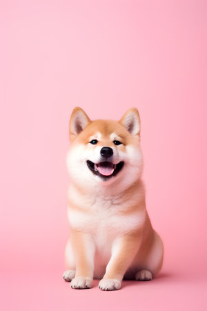 Studio portrait of a cute shiba inu dog sitting on pink background
