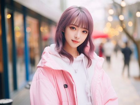 An AI-generated illustration of A young adult wearing a pink jacket standing alone in the night on a city street illuminated by streetlights.