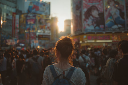Female traveler with a backpack observes a lively city scene filled with people and colorful billboards, capturing the essence of urban exploration and adventure