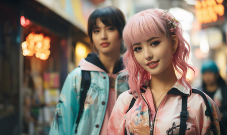 Group of positive Korean students on street portrait image, ai generated. Happy japanese friends walking together picture photorealistic photography. Urban lifestyle concept photo realistic