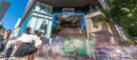 Tokyo, Minato Ward - August 17, 2018 : Motion blurred people walking in front of Tokyu Plaza Harajuku