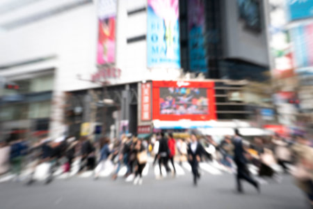 Tokyo, Japan - Jan 10, 2019: Motion blur of people walking at Shibuya crossing and car traffic transportation across intersection. Asia tourist attraction, Japan tourism, or Asian city life concept