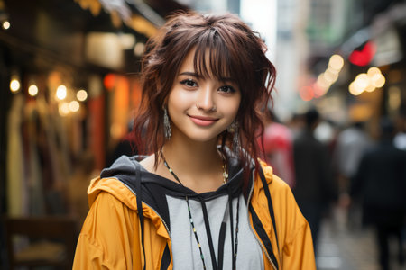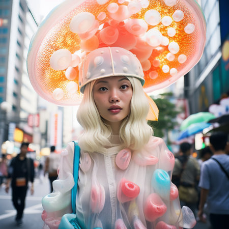 Beautiful Japanese Lady with jellyfish on hair, standing on street, jellyfish costume, fashion