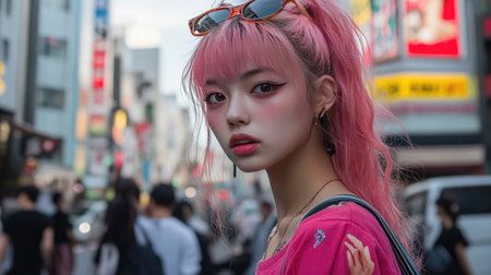 Japanese woman, 20 years old, modeling unique fashion on the bustling streets of Shibuya, blending into the energetic cityscape.