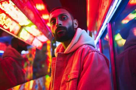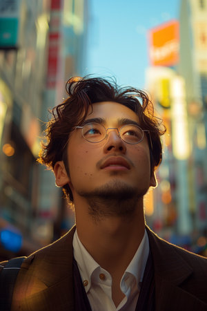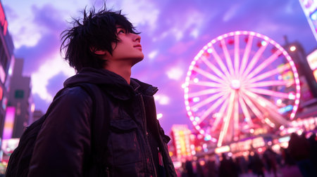 young man gazes up at vibrant cityscape illuminated by colorful lights, with ferris wheel in background. scene captures sense of wonder and excitement in urban environment.