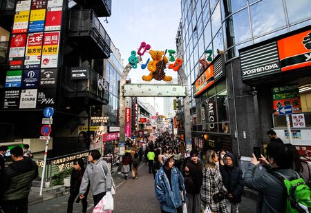 TOKYO, JAPAN - FEBRUARY 7, 2019: Unidentified people walk along Takeshita street in Harajuku, a famous Japanese cosplay fashion street.