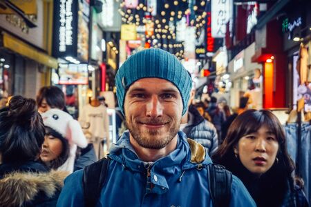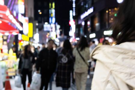 Seoul, South Korea - December 15, 2018: The night streets of Seoul never sleep. In the evening, thousands of different people walk there.