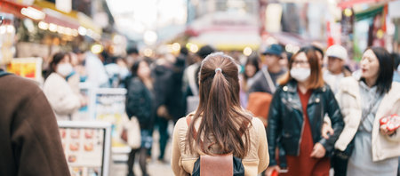 Tourist woman visit Ameyoko market, a busy market street located in Ueno. Landmark and popular for tourist attraction and Travel destination in Tokyo, Japan and Asia concept