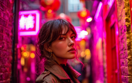 A young woman stands confidently in a colorful alley illuminated by glowing neon signs and lanterns. The scene captures the energy of nightlife in a bustling city.
