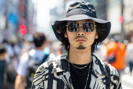 A stylish young man stands out in a crowded city street, wearing sunglasses and a bucket hat while displaying a bold shirt. The lively atmosphere is enhanced by movement and sunny weather.