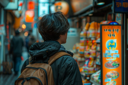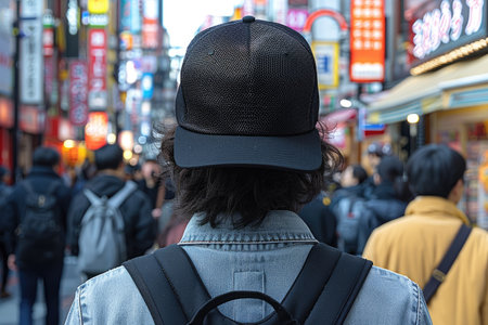 Female traveler with backpack gazes at lively urban street filled with people and colorful advertisements, embodying the spirit of adventure and exploration